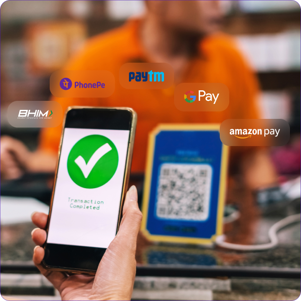 Customers either scan the QR code with their UPI app or initiate a bank transfer.